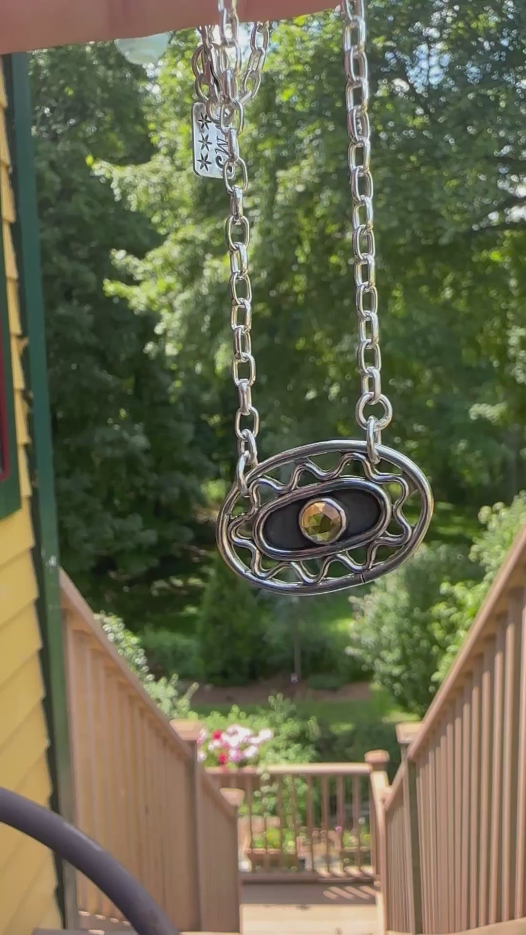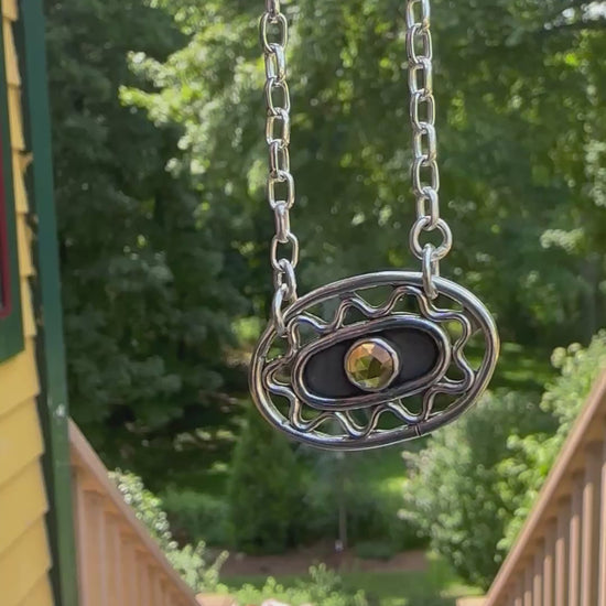 Sparkling rose-cut, 6mm Citrine is framed in a wavy, hazy sun open design. Peek-a-boo setting allows light to pass through the stone for maximum sparkle. Oxidized backdrop to the stone adds drama. Polished to a high shine. Substantial sterling silver oval rolo chain is 18" and shiny. With pendent necklace measures just over 19".